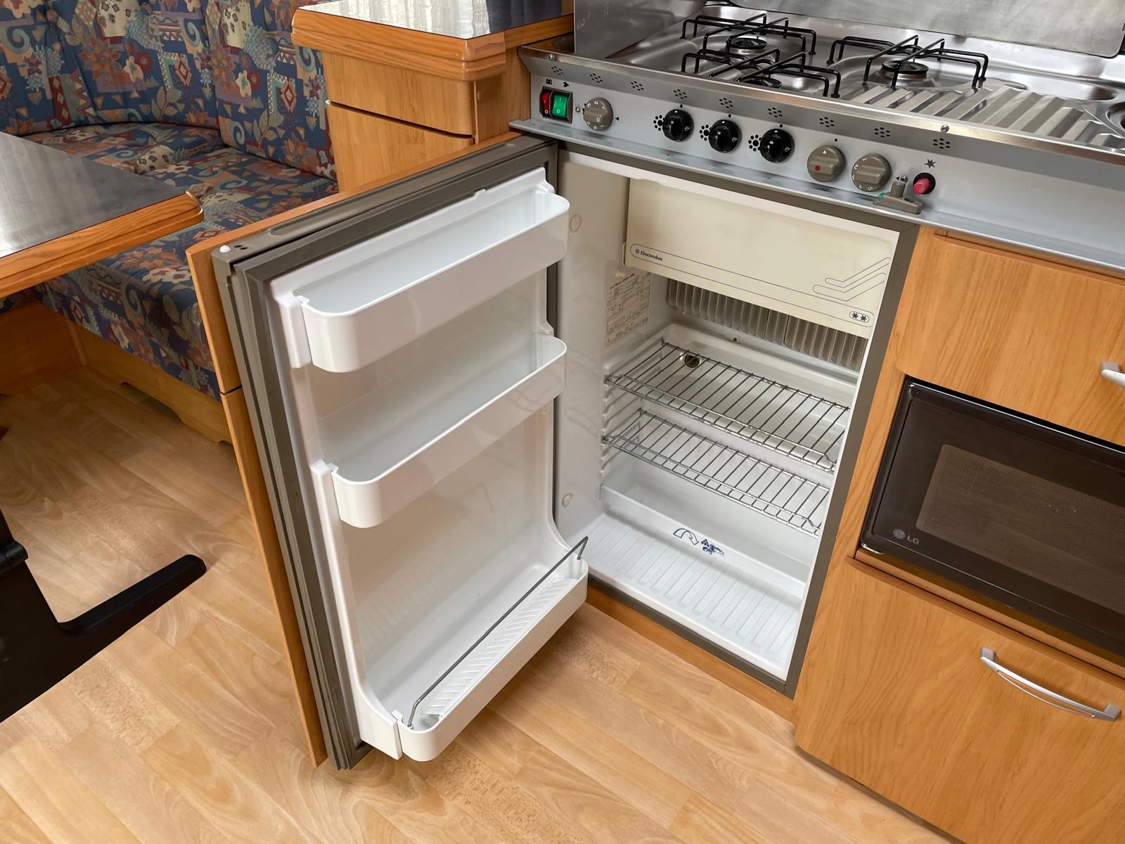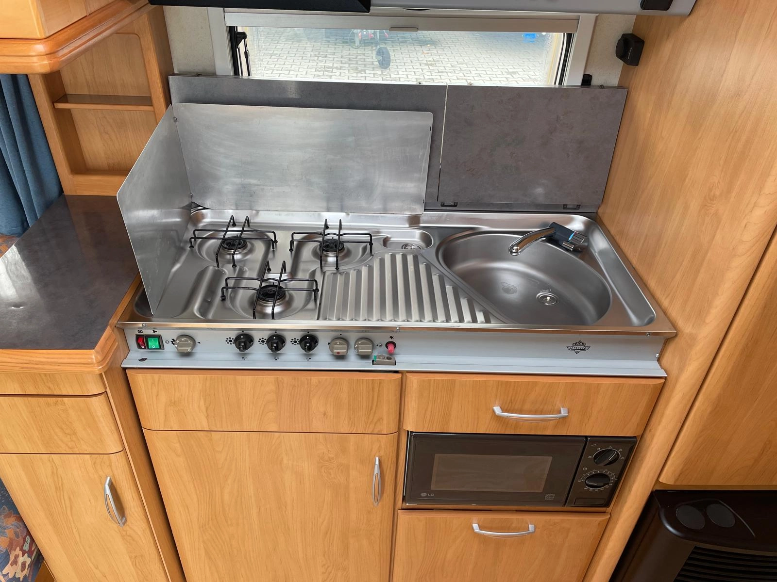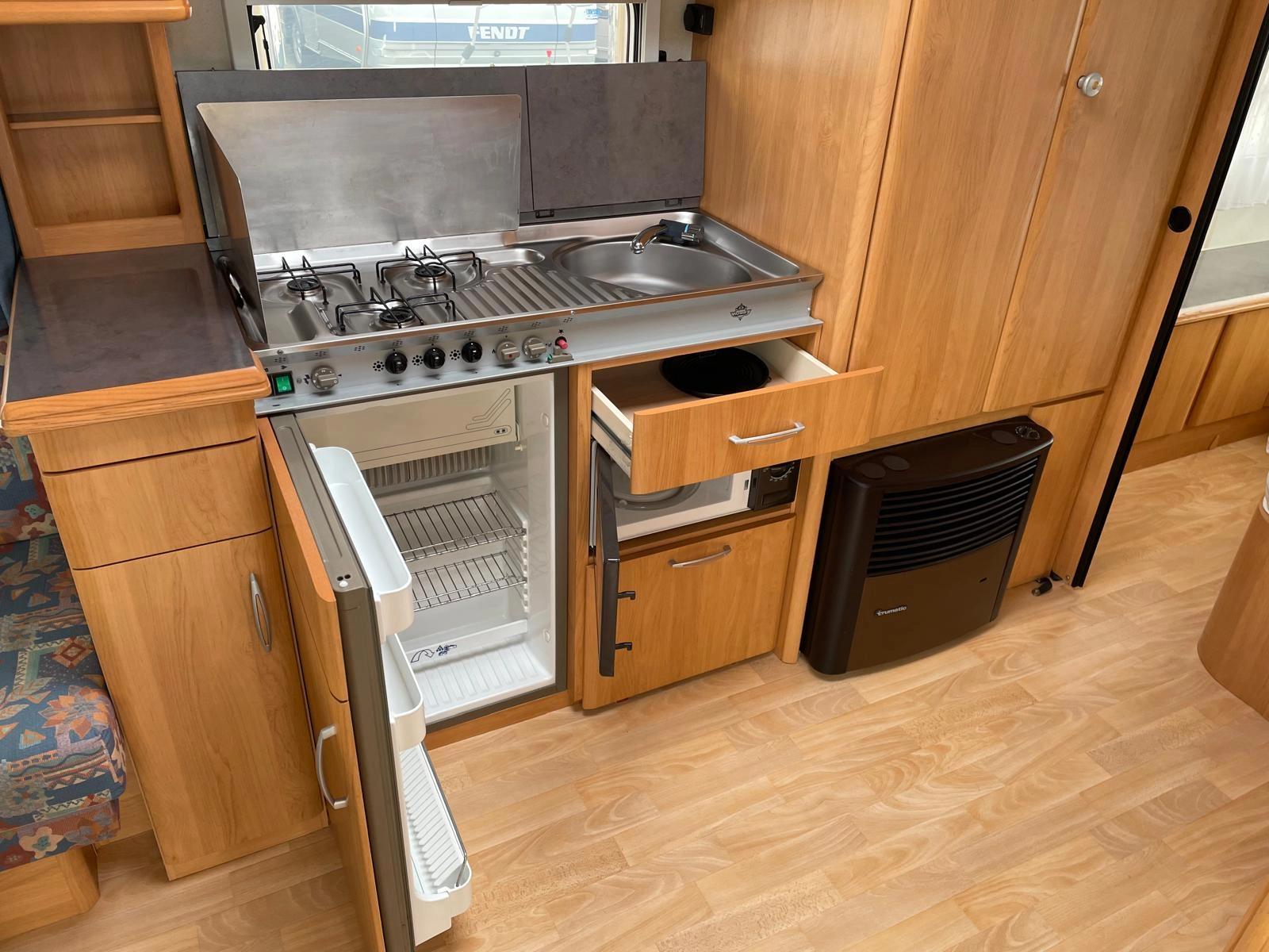 Kuchyň-tříplotýnkový plynový vařič, dřez, trojkombinovaná lednice