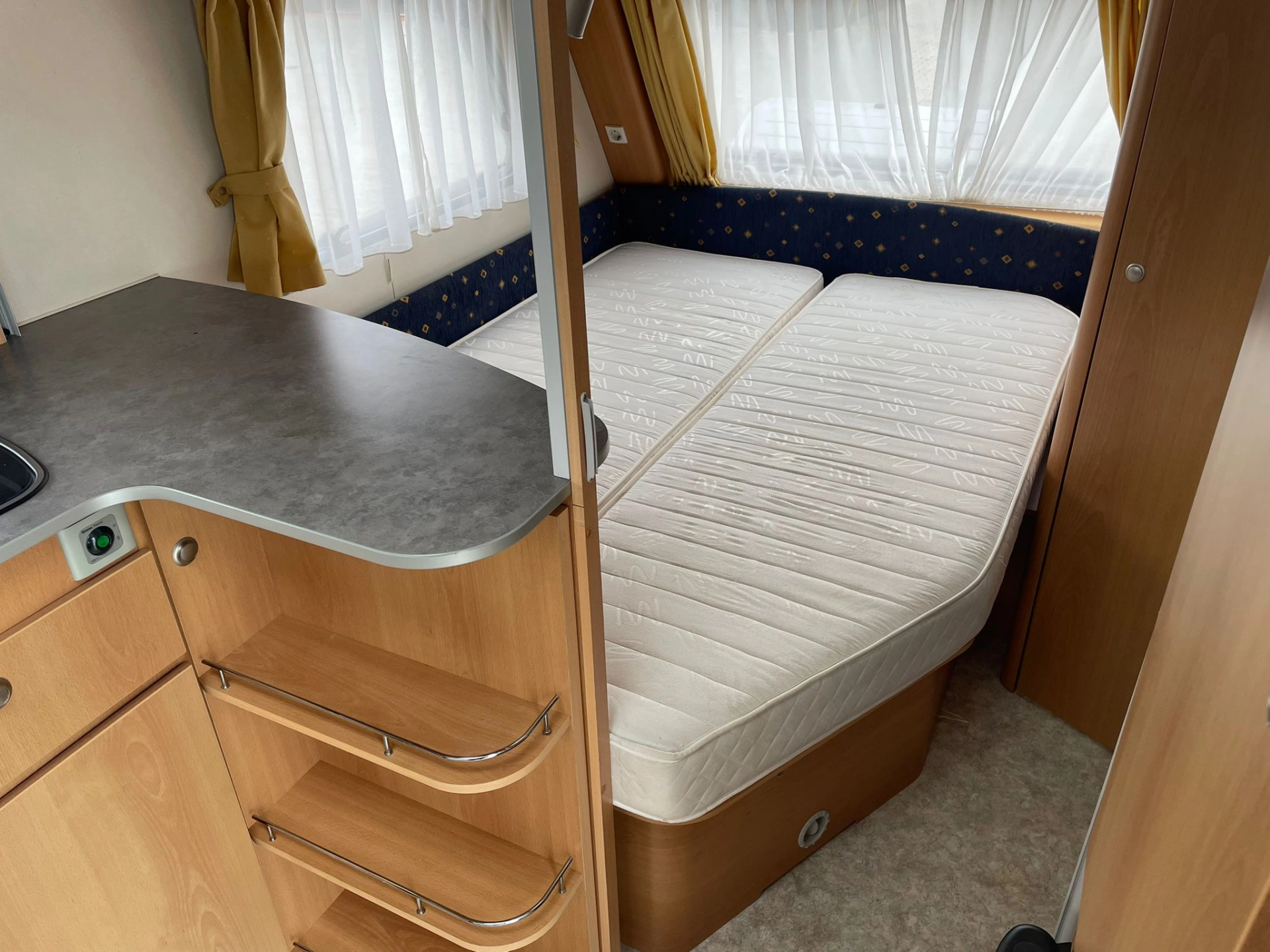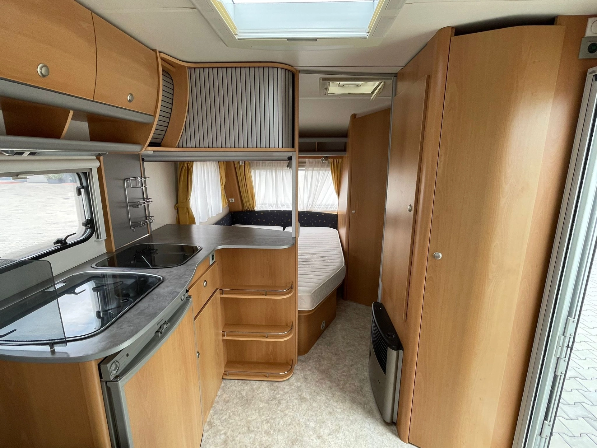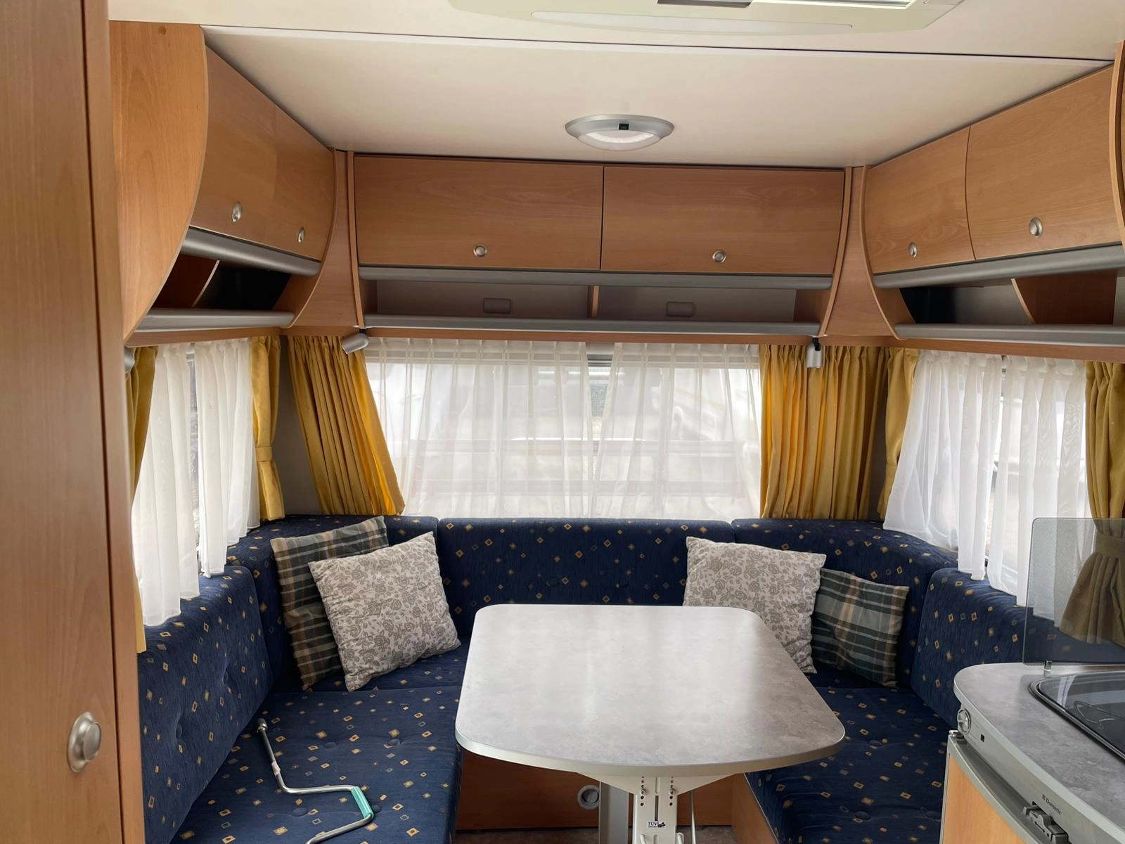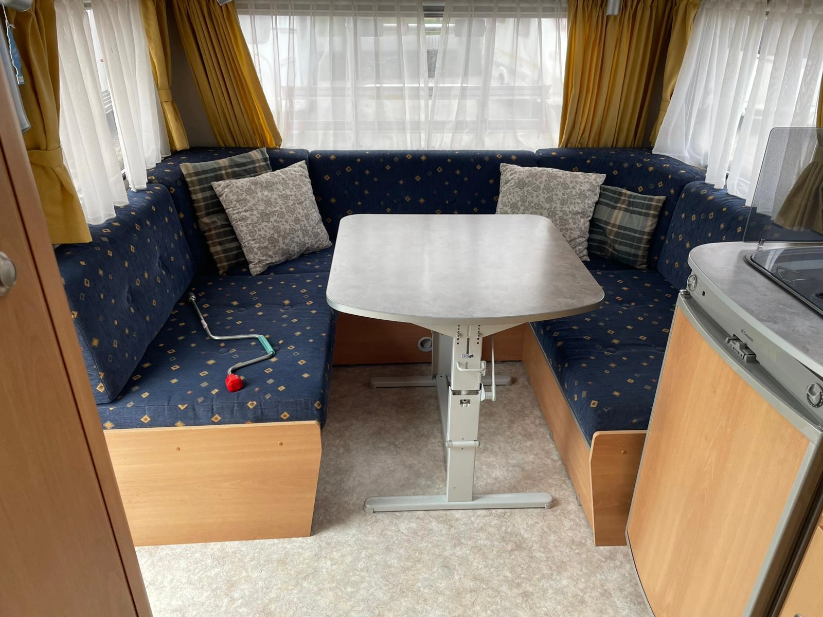 Nabízíme dobře řešený karavan Kip s francouzskou postelí a velkým rozložitelným sezením do tvaru U. Karavan je bez zápachu, zachovalý a plně funkční. Výhodou oproti většině karavanů je elektricky vyhřívaná podlaha díky čemu je karavan použitelnější pro celoroční používání-tedy i v zimním období. Dále má karavan elektrický bojler a uzavíratelný stan.