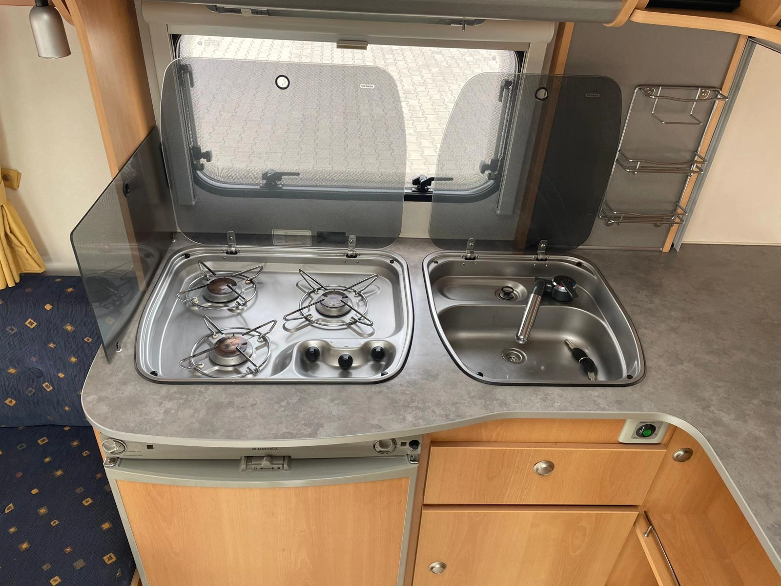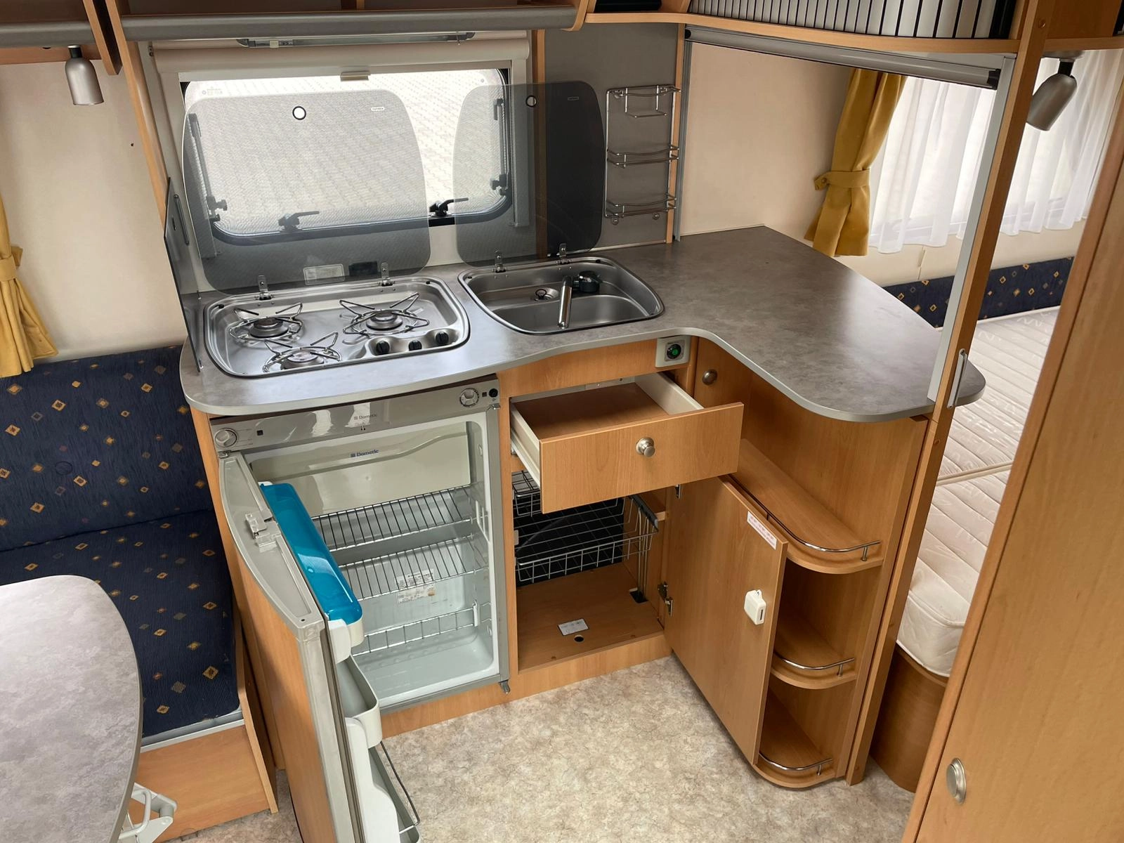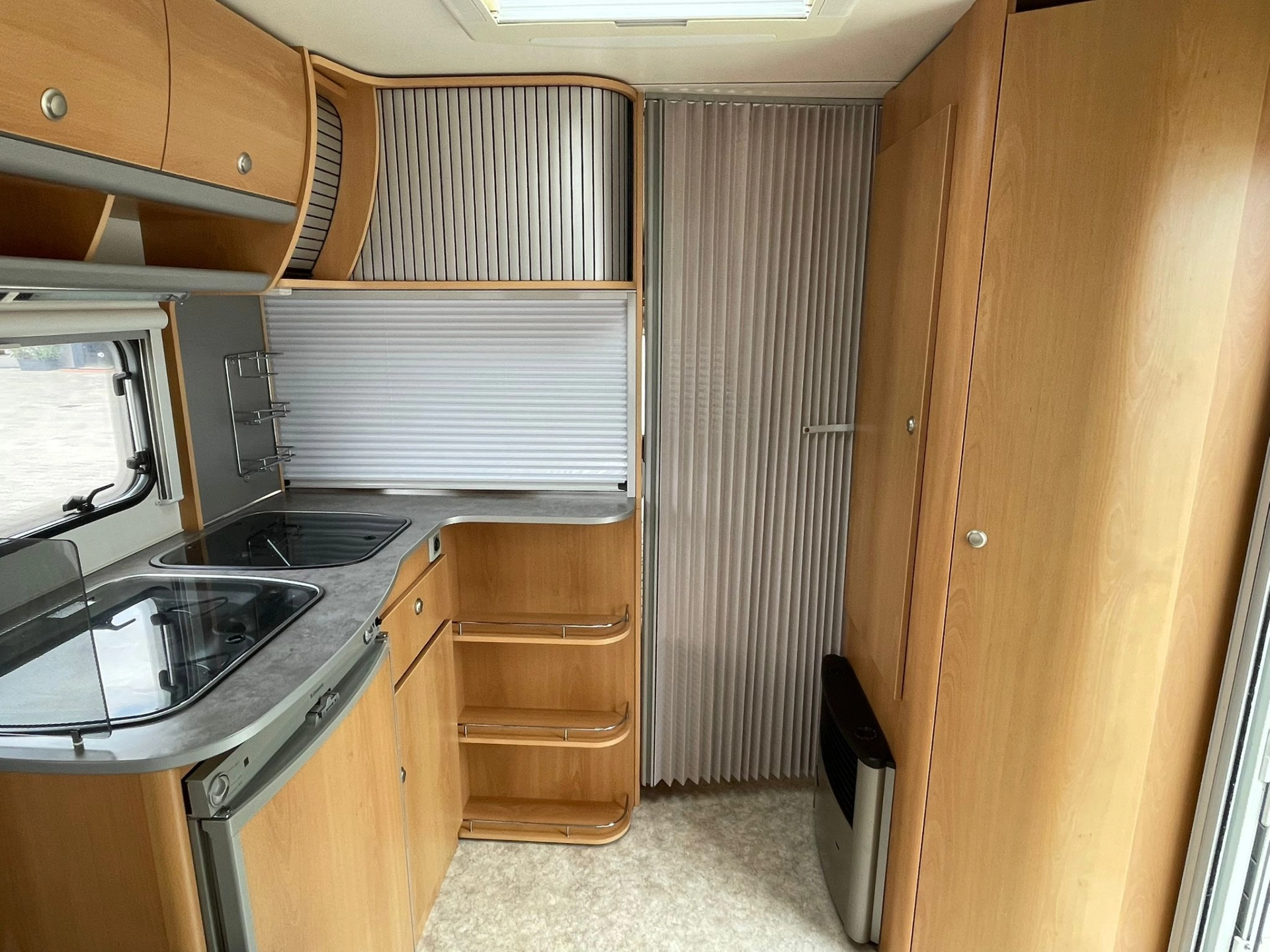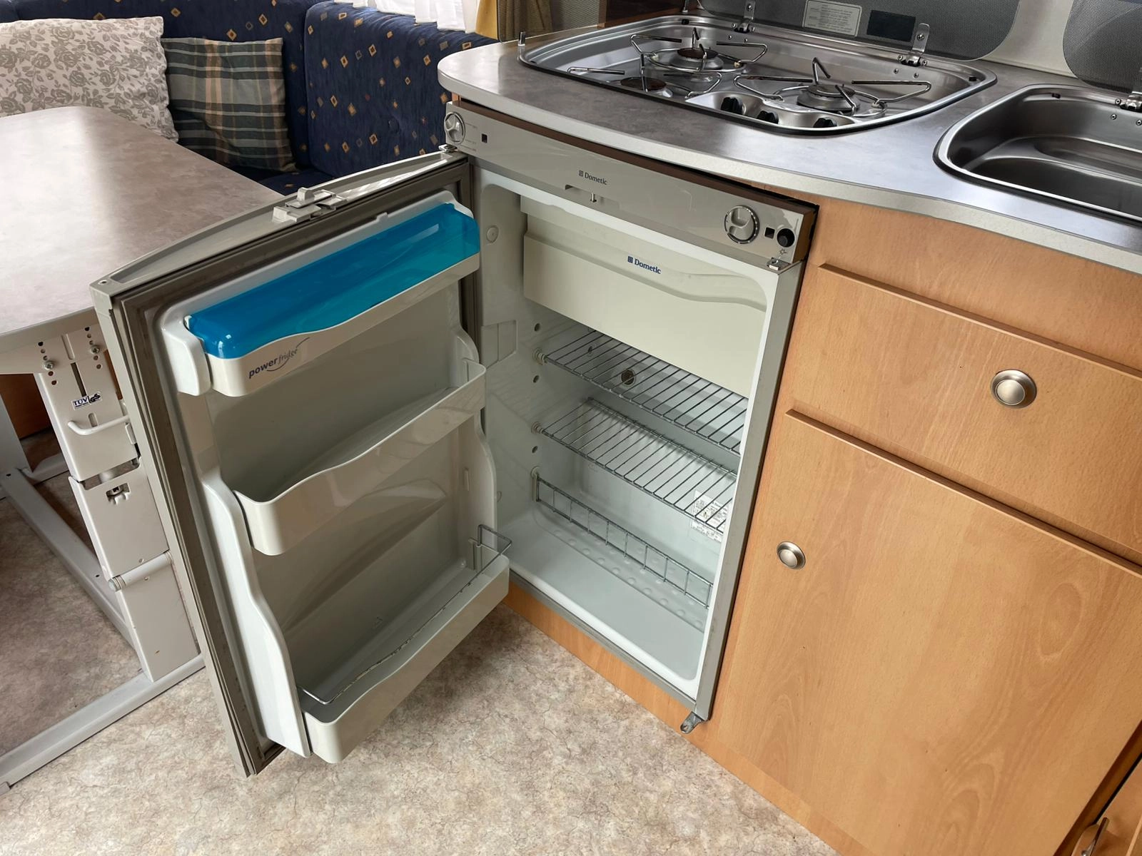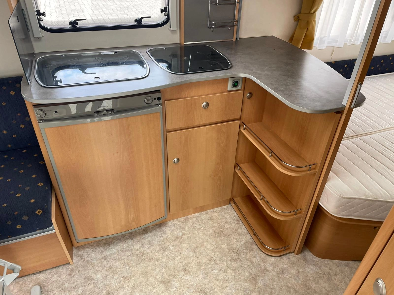 Nabízíme dobře řešený karavan Kip s francouzskou postelí a velkým rozložitelným sezením do tvaru U. Karavan je bez zápachu, zachovalý a plně funkční. Výhodou oproti většině karavanů je elektricky vyhřívaná podlaha díky čemu je karavan použitelnější pro celoroční používání-tedy i v zimním období. Dále má karavan elektrický bojler a uzavíratelný stan.